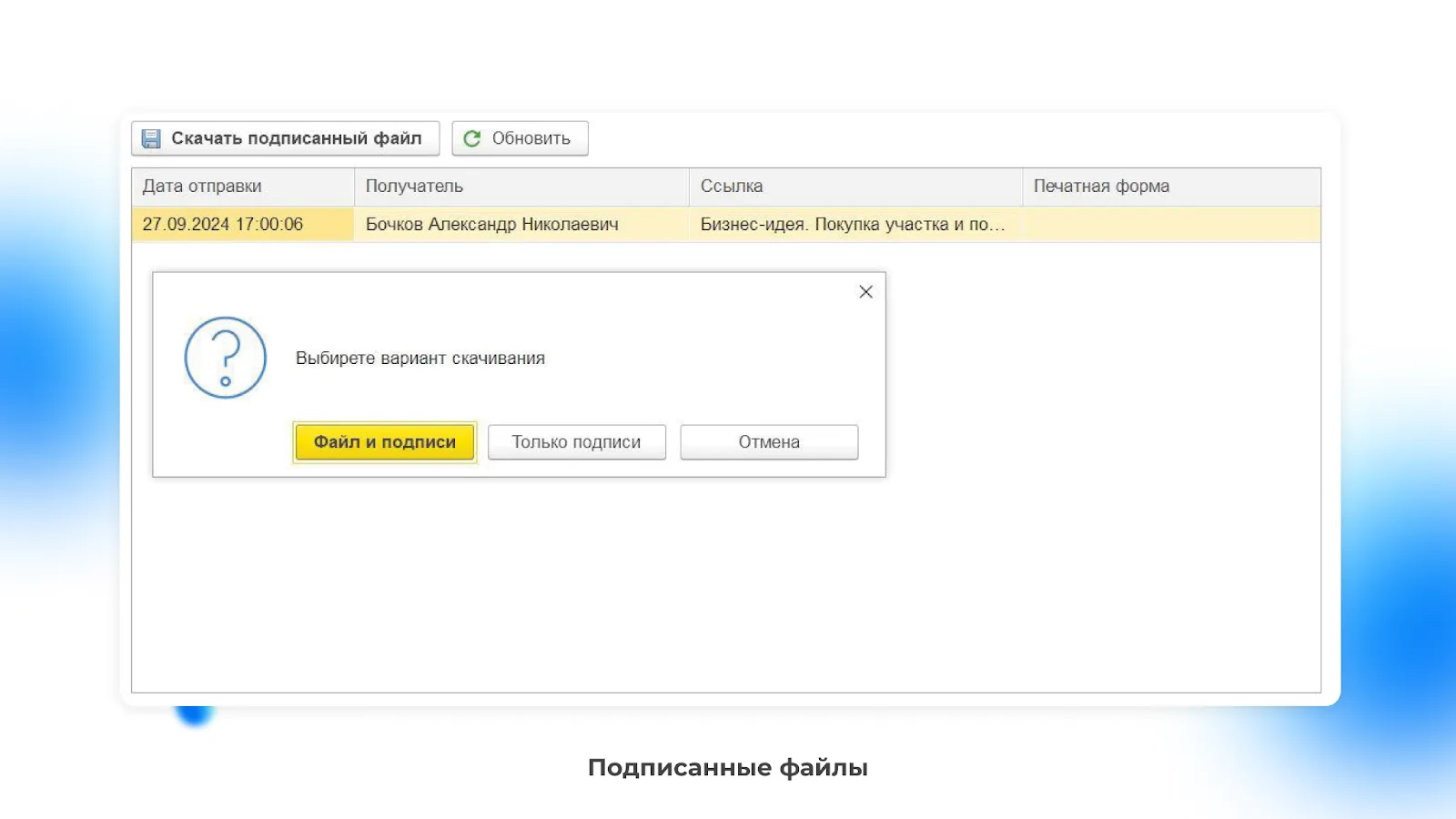 В результате подписания вы сможете скачать файл, выбрав необходимый подписанный документ.