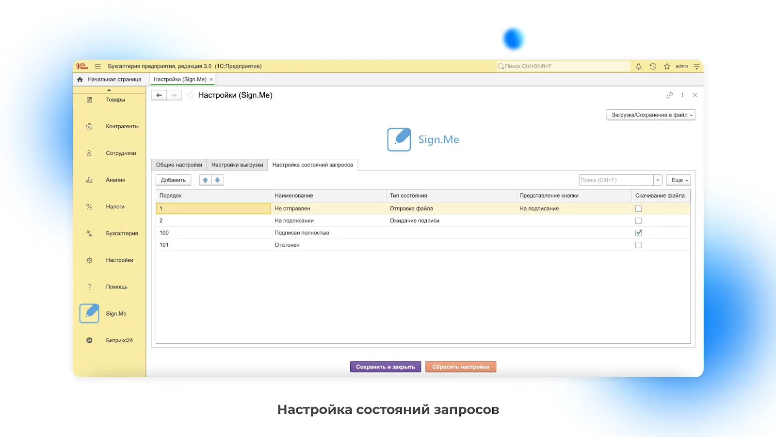 1С – это система автоматизации и управления бизнес-процессами. Функциональность 1С охватывает такие сферы, как бухгалтерский учёт, управление персоналом, работу с клиентами, документооборот и многое другое. В штатной версии 1С документы подписываются с помощью токенов, которые не всегда удобны для работы с физлицами. Для подписания документов с клиентами или сотрудниками есть интеграционный модуль от Sign.Me, который можно просто скачать и установить.