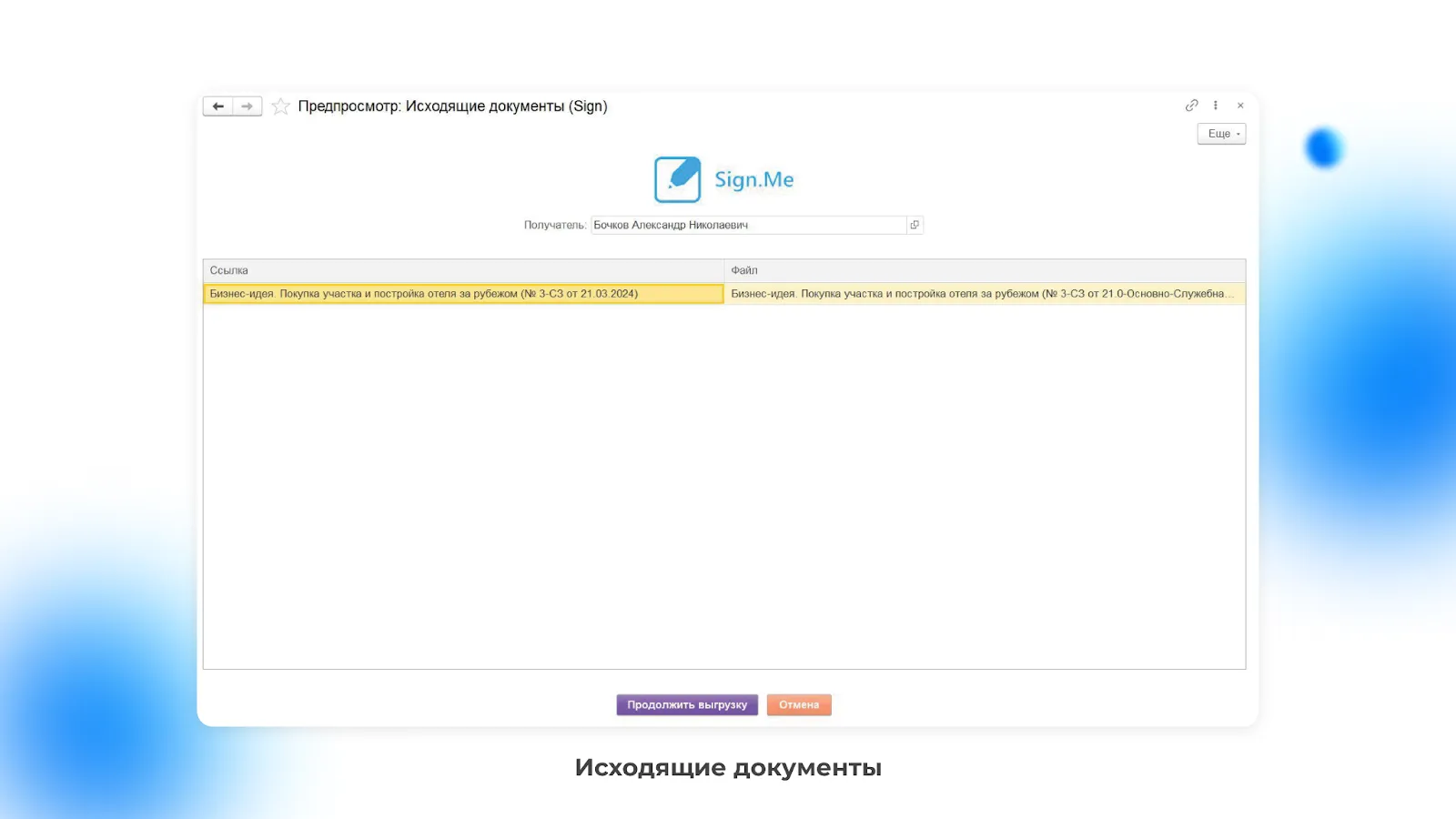 После нажатия на кнопку «На подпись» у вас откроется окно отправки документа. Появление кнопки «Продолжить выгрузку» означает, что документ отправлен получателю.