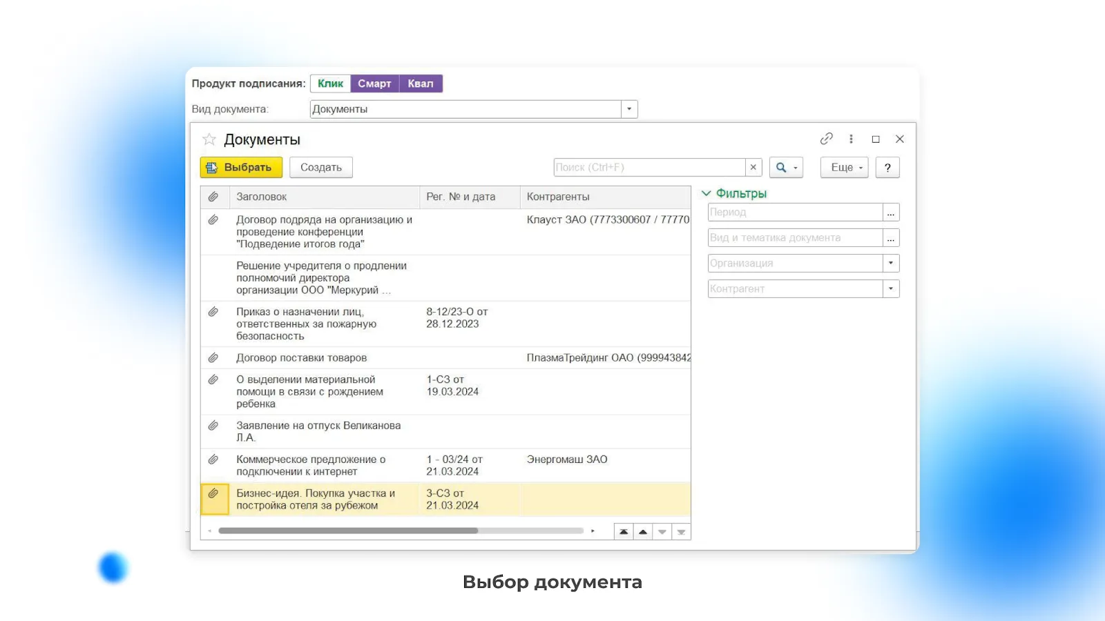 Когда пользователь выбирает по фильтру определённый статус документа, список автоматически обновляется. Если документ успешно подписан, появятся специальные кнопки для скачивания архива подписания. Он содержит электронную подпись в формате sig, подписанный документ и, если подписание было через Клик, публичный ключ и копию документа со штампом.