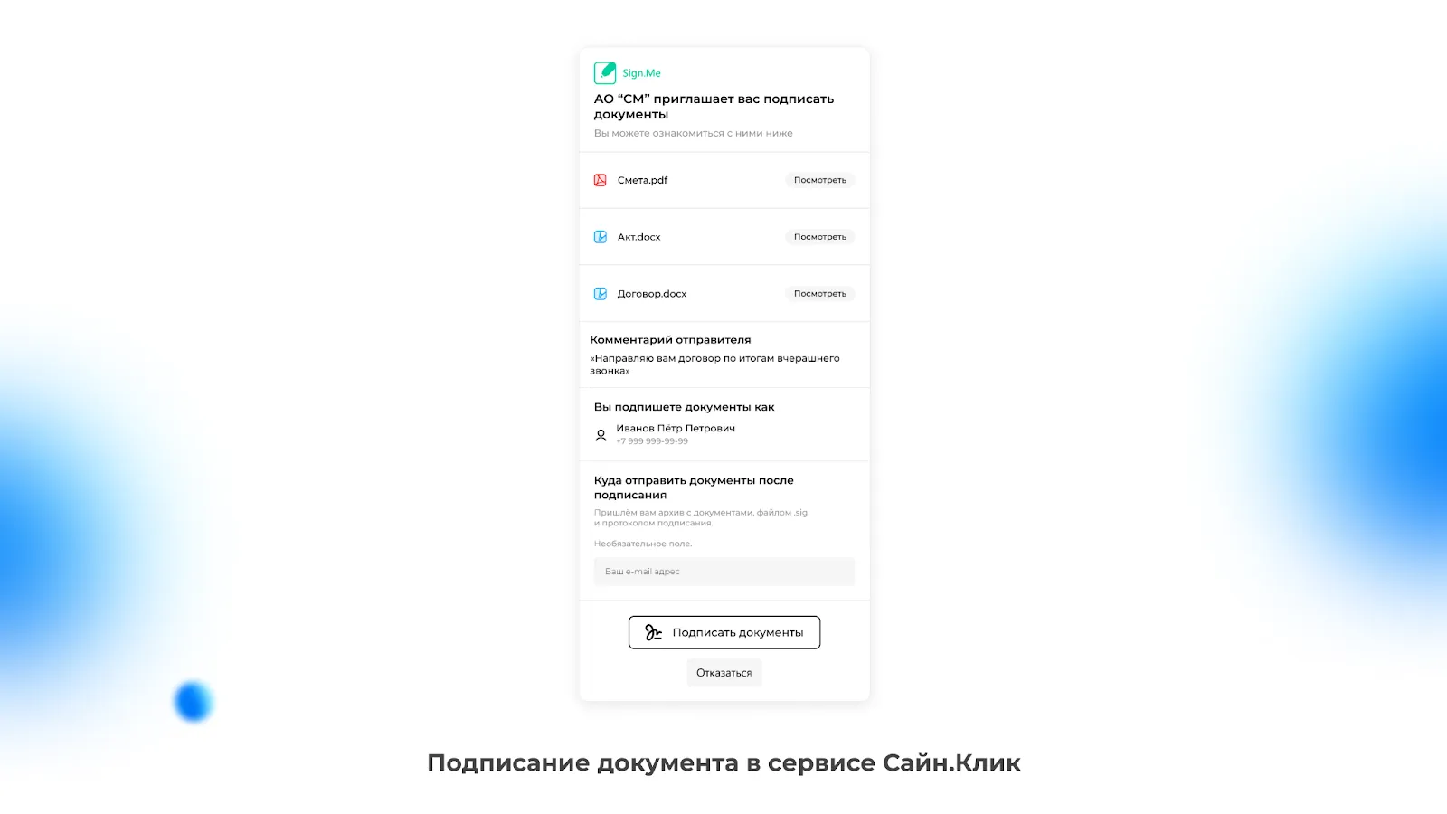 При выборе Сайн.Клика для отправки документа на подписание необходимо только ввести номер телефона и ФИО адресата.