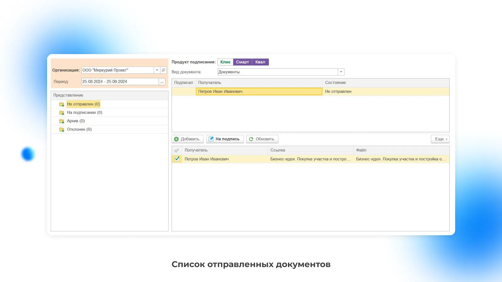 После нажатия на кнопку «Добавить» вы сможете выбрать получателя и документ.