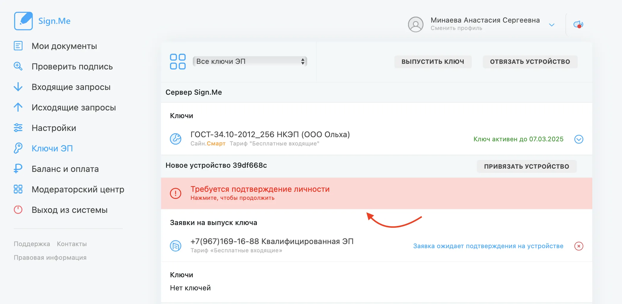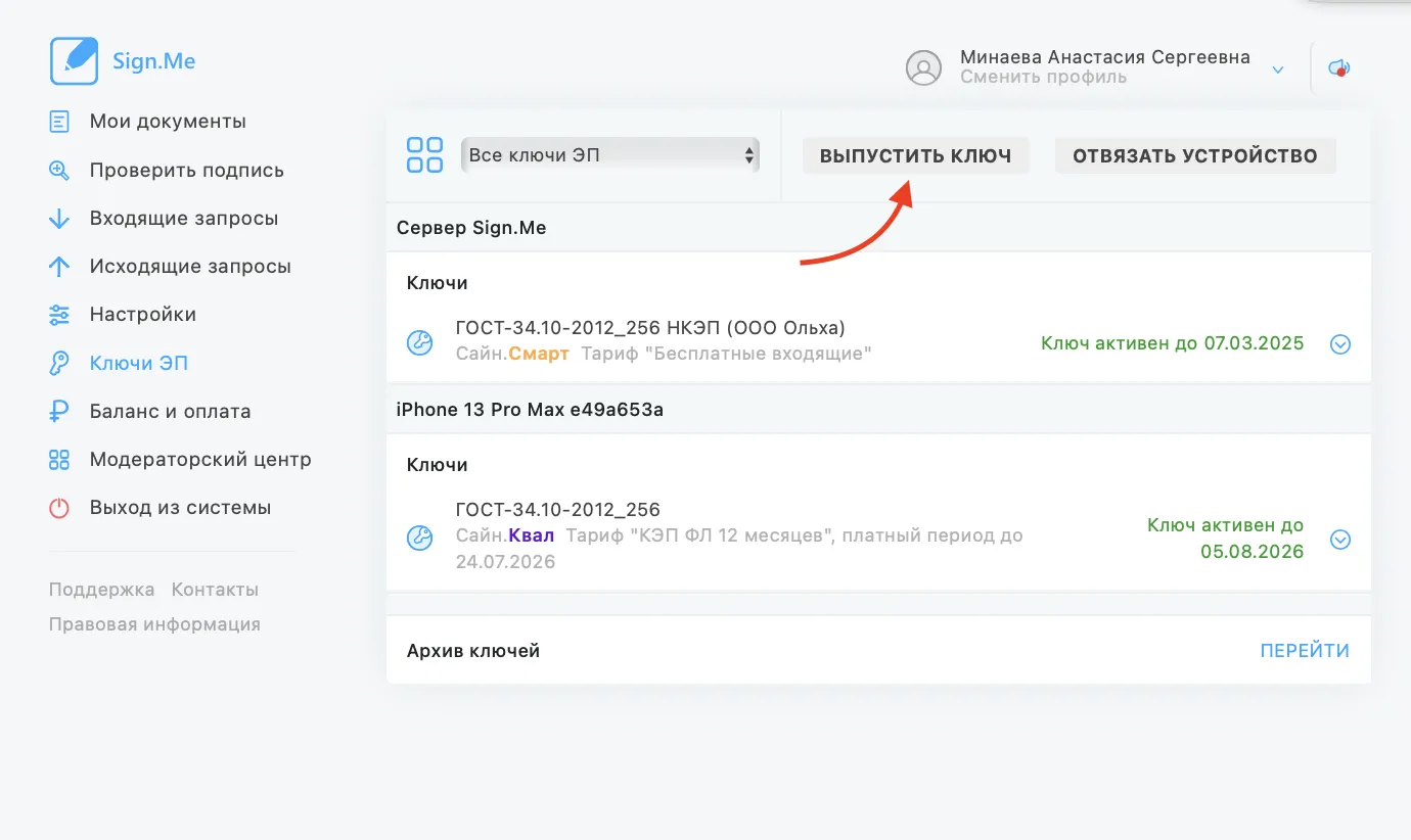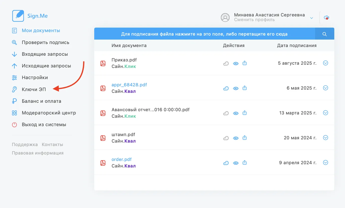 2. Перейдите в раздел «Ключи ЭП»