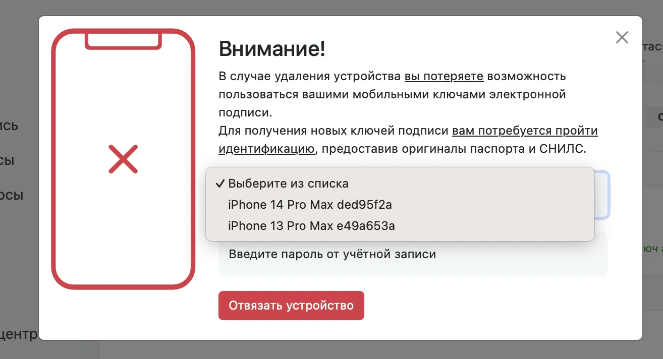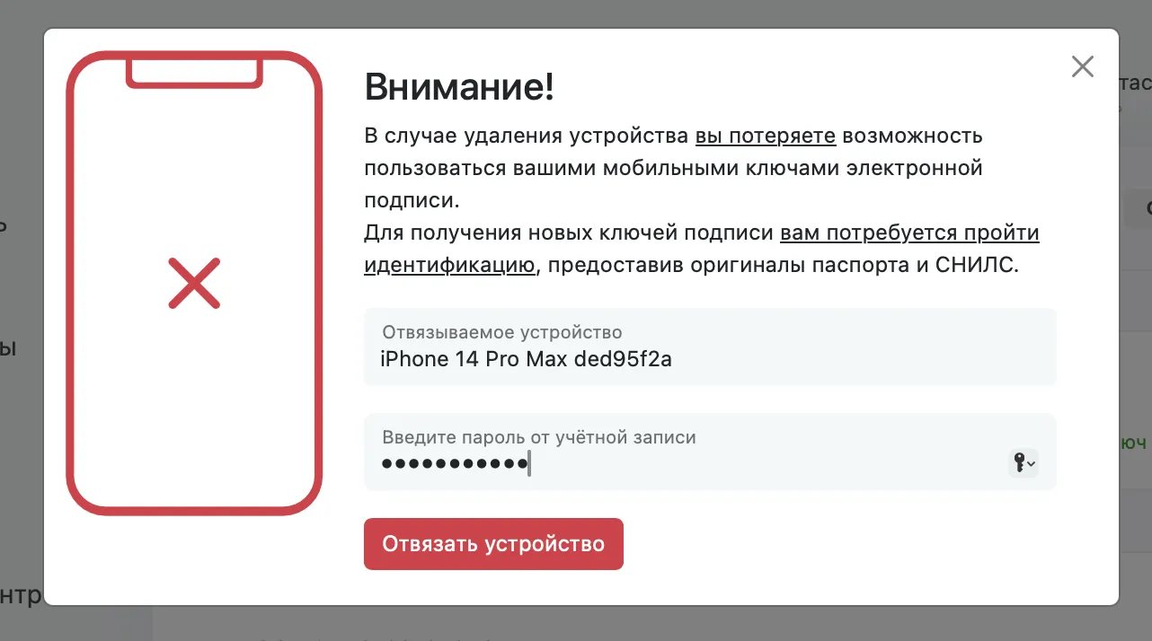 Отвязка устройства необходима, если у вас сменилось устройство, либо если вы потеряли устройство и вам нужно срочно обезопасить свою электронную подпись.