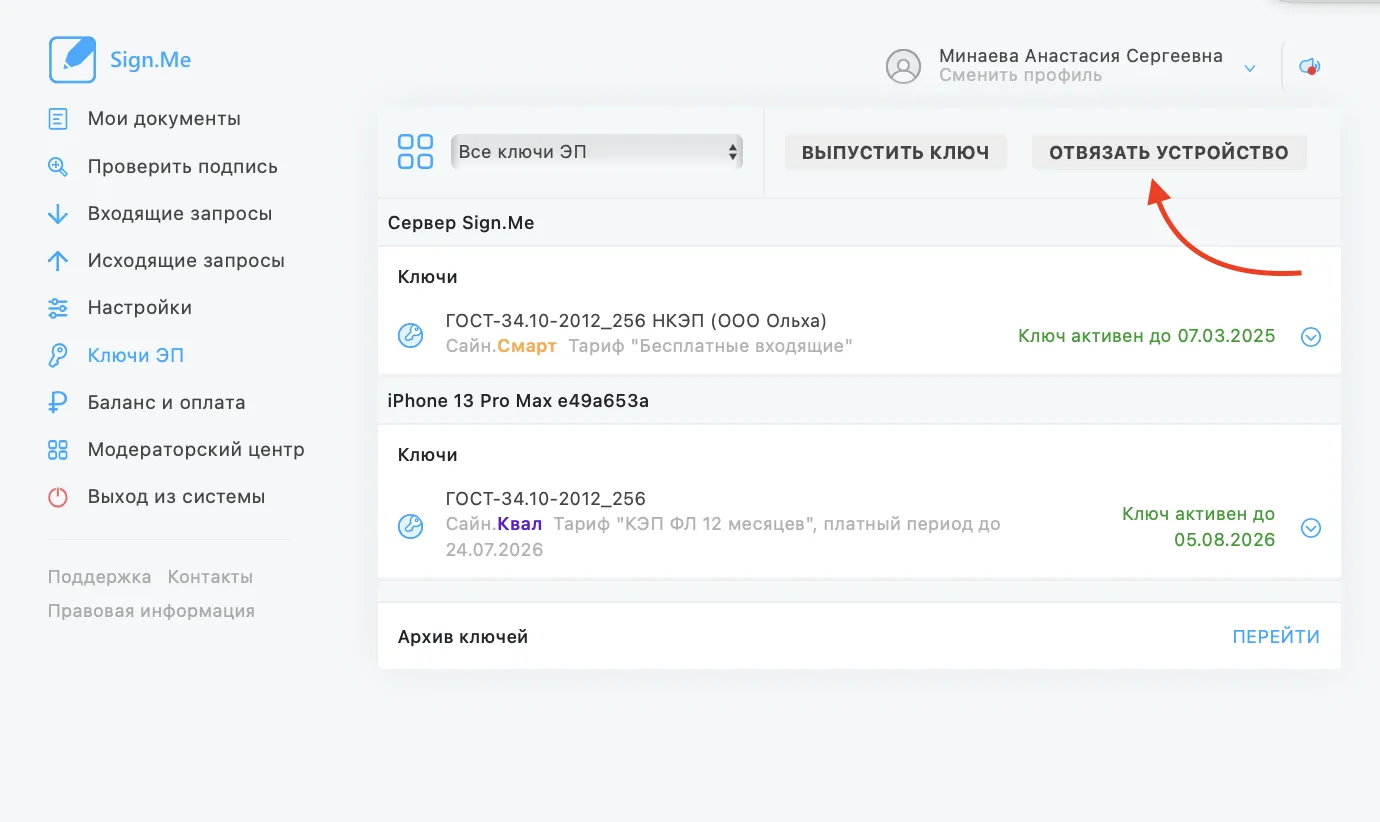 Это отсоединение вашего компьютера, планшета или мобильного телефона от своего аккаунта на нашем сайте или в мобильном приложении. Когда вы отвязываете устройство, между сервером Sign.Me и мобильным приложением удаляется соединение. Также ваш приватный ключ удаляется из мобильного устройства или с компьютера – значит, вы больше не сможете пользоваться нашим приложением и подписывать документы.