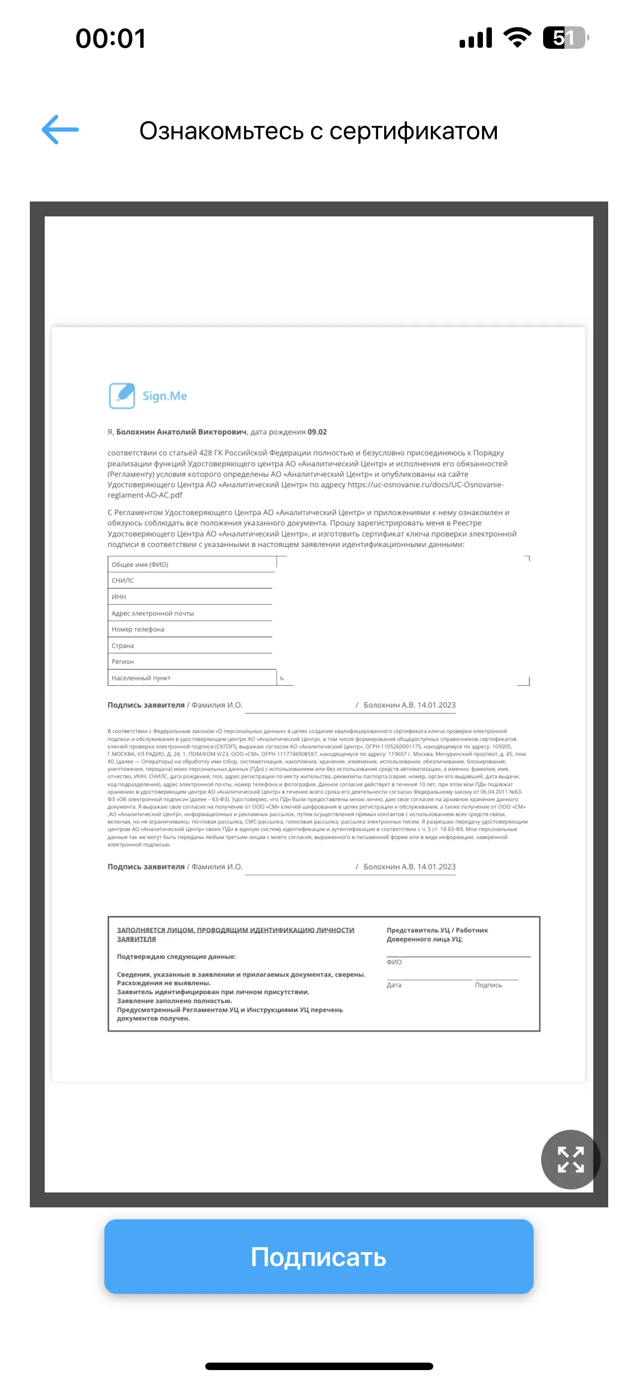 16. Дождитесь загрузки сертификата, ознакомьтесь с содержимым и нажмите кнопку «Подписать»