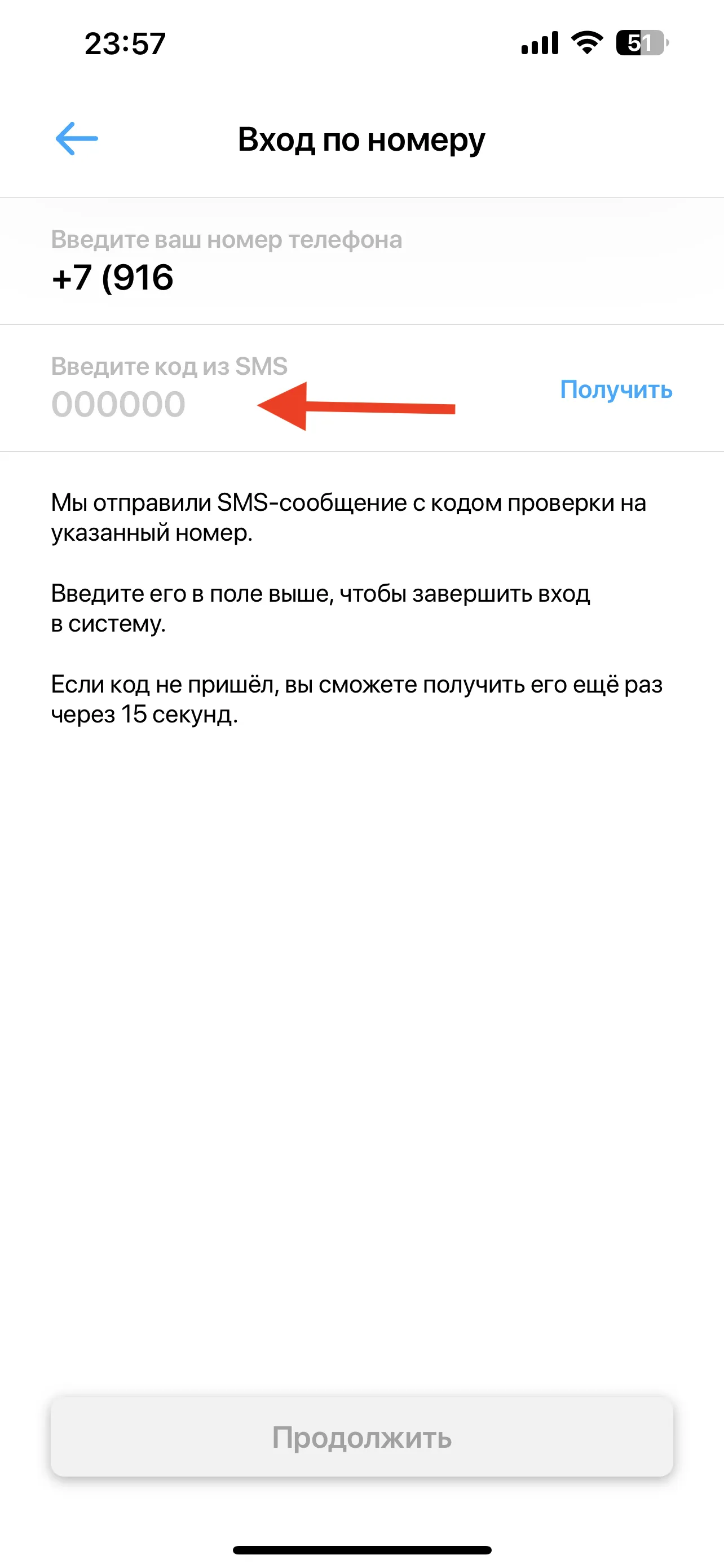 5. Дождитесь СМС-код и введите его в соответствующее поле, затем нажмите кнопку «Продолжить»