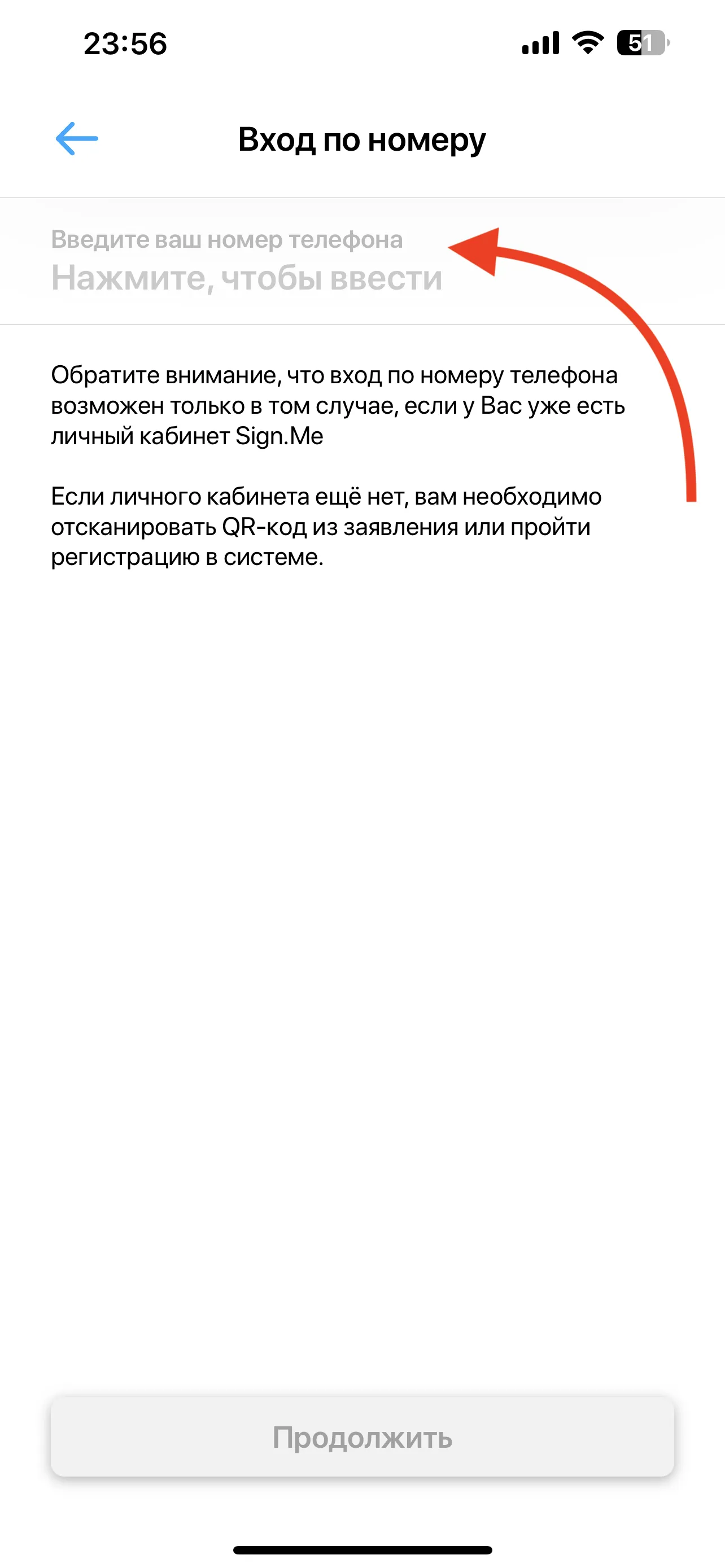 4. Введите номер телефона от личного кабинета Sign.Me и нажмите кнопку «Продолжить»