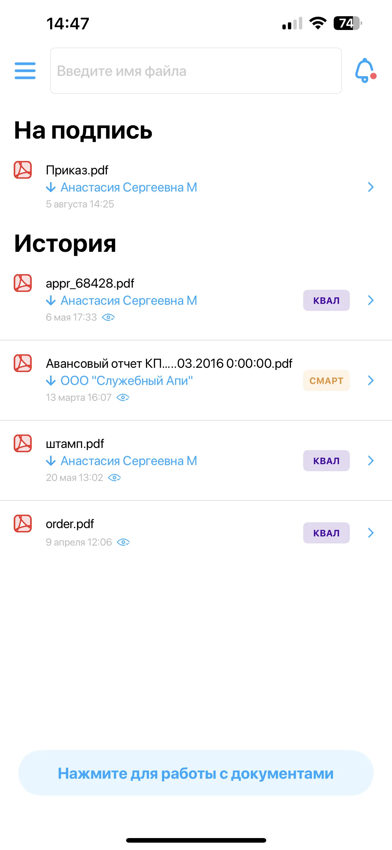 В списке находятся документы, которые вам отправили на подпись, либо документы, которые вы сами загрузили в приложение.